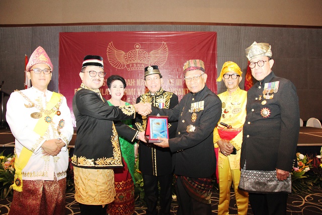 Ketua Umum FSKN terpilih Sultan Haji Khairul Saleh Al-Mu”tashim Billah (kedua kiri) didampingi Sekretaris Jenderal FSKN terpilih, Dr. Ir. KRAy. Naniek Widayati Priyomarsono, M.T (ketiga kiri) saat menerima cinderamata yang diserahkan oleh Pemangku Adat dari Brunei Darussalam, Datuk Hamdan (ketiga kanan) pada acara Musyawarah Nasional ke-III Forum Silaturahmi Karaton Nusantara (FSKN).