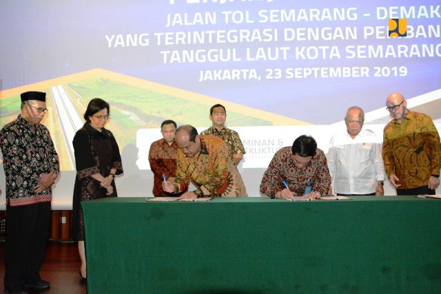 “Beberapa bulan lalu Tol Trans Jawa diresmikan dari Merak sampai dengan Pasuruan dan akan kita teruskan ke Banyuwangi melewati jalur tengah. Hari ini kita mulai pembangunan tol meneruskan dari Semarang ke Surabaya di jalur utara. Pada tahap awal kita bangun Semarang-Demak yang digabungkan dengan tanggul laut sekaligus untuk menanggulangi rob di semarang,” kata Menteri Pekerjaan Umum dan Perumahan Rakyat (PUPR) Basuki Hadimuljono dalam sambutannya pada acara penandatanganan tiga perjanjian yang juga disaksikan oleh Menteri dan Menteri Keuangan Sri Mulyani di Auditorium Kementerian PUPR, Jakarta, Senin, 23/9/2019.